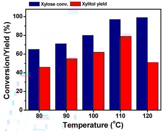 The effect of the temperature was then studied (Figure 4). When the temperature was increased from 110 °C to 120 °C, the conversion was similar but the yield in xylitol dropped from 79% to 51%; this was due to the formation of undetermined by-products such as humins. Hence, the solution was dark brown showing the formation of degradation products. A decrease in the temperature from 110 °C down to 80 °C led to a decrease in the xylose conversion from 79% to 65% along with a decrease in the yield in xylitol from 79% to 46%. The selectivity of the reaction was in the range of 70% to 80% for temperature range from 80 °C to 110 °C. At 80 °C, the reaction was prolonged up to 6 h, and we were pleased to see that 94% of xylose was converted to 70% of xylitol (75% of selectivity in xylitol). Hence, it is a compromise between the temperature and the reaction time; however, the maximum temperature should be 110 °C in order to avoid side reactions.