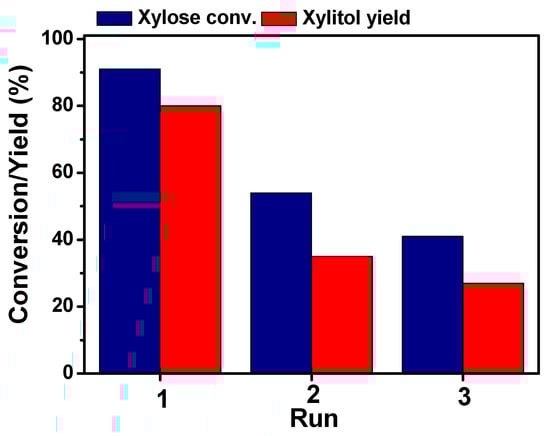One important parameter is the stability of the Ni3Fe1 BMNPs; thus, this was examined by consecutively repeating the DES phase hydrogenation reaction under optimized conditions (H2 = 30 bar, 3 h, 110 °C). To this end, the catalyst was magnetically recovered and washed thoroughly with distilled water and methanol (3 × 10 mL) in an ultrasonic bath sonicator at room temperature (25 °C). Then, the used catalyst was reused with a fresh charge of sugar for subsequent recycle runs under the same reaction conditions. Notably, the recovered catalyst was processed consecutively for the next run without involving reactivation steps. As shown in Figure 5, after each run the xylose conversion decreased from 91% to 54% and subsequently to 41%. A similar trend can be consecutively noticed in the xylitol yield from 79% down to 35% and then down to 27% for the third cycle.