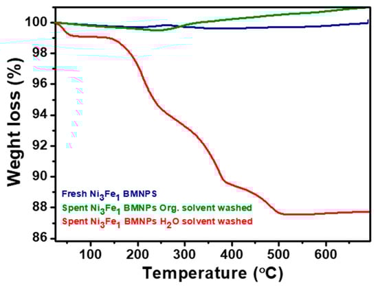 Thermogravimetric analysis (TGA) of fresh and spent Ni3Fe1 BMNPs after washing for recycling experiments.