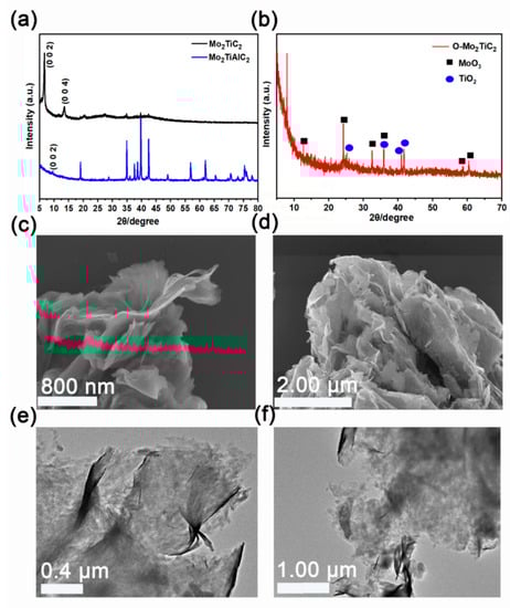 To investigate the structural features of Mo2TiAlC2, Mo2TiC2 MXene, and O-Mo2TiC2, we performed X-ray diffraction (XRD) analysis on these three materials (Figure 1a,b). Compared with Mo2TiAlC2, the (002) diffraction peak of Mo2TiC2 MXene has shifted to a lower angle (2θ from 9° to 7°), indicating that the interlayer spacing increases after the addition of tetrabutylammonium hydroxide. In addition, there is a characteristic weak peak of the (004) crystal plane, which is consistent with the formation of the MXene phase. As shown in Figure 1b, the diffraction peaks of MoO3 and TiO2 are observed in O-Mo2TiC2, which is consistent with literature reports [52,53,54,55], indicating the successful synthesis of oxidized Mo2TiC2. According to Figure S1, compared with the Mo2TiC2 EDX spectrum, there is no Al peak in the Mo2TiC2 MXene, indicating that the aluminum element was completely removed during the etching process. Figure 1c,d depict the morphology of the O-Mo2TiC2 forming process. As shown in Figure 1c, Mo2TiC2 MXene has obvious layered and sheet-like structures. The morphology and structure of O-Mo2TiC2 synthesized by the hydrothermal method did not change in Figure 1d. Compared with the Mo2TiC2 MXene, the O-Mo2TiC2 still maintains the corresponding layered structure, indicating that the layered structure and crystallinity of Mo2TiC2 MXene are hardly influenced by the oxidation process. In order to further determine the morphology and structural characteristics of Mo2TiC2 MXene and O-Mo2TiC2, we also carried out transmission electron microscopy (TEM) analysis, and the analysis results are shown in Figure 1e,f. It can be seen from the TEM images that the O-Mo2TiC2 and Mo2TiC2 MXene maintain a nearly similar layered structure.