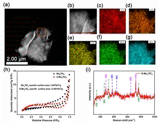 (a–g) EDX elemental mapping images of C, O, Ti, and Mo in O-Mo2TiC2. (h) N2 adsorption–desorption isotherms for Mo2TiC2 MXene and O-Mo2TiC2. (i) Raman spectra of O-Mo2TiC2.