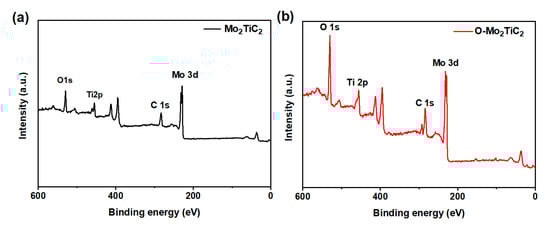 We also conducted X-ray photoelectron spectroscopy (XPS) analysis of the Mo2TiC2 MXene and O-Mo2TiC2, from which the chemical composition and valence state of each element during the oxidation reaction could be determined, which clearly confirmed the surface functional groups of the samples before and after the reaction. The XPS survey spectrum (Figure 3a,b) shows the presence of O, Ti, C, and Mo as the main components of Mo2TiC2 MXene and O-Mo2TiC2.