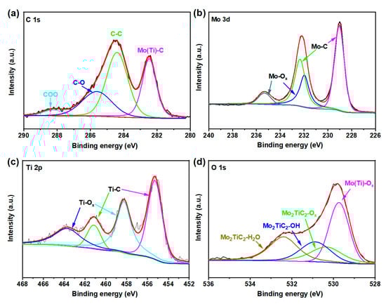 High-resolution XPS spectra of O-Mo2TiC2: (a) C 1s, (b) Mo 3d, (c) Ti 2p, and (d) O 1s.