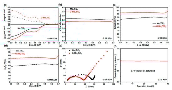 As shown in Figure 5b, the number of transferred electrons of O-Mo2TiC2 is closer to 2e−. Therefore, O-Mo2TiC2 is easier to carry out the 2e−ORR process so as to achieve the purpose of H2O2 production. The H2O2 selectivity of O-Mo2TiC2 is maintained above 83% (Figure 5c), and the H2O2 selectivity reached the peak of 90% at 0.7 V vs. RHE, which is much higher than the highest H2O2 selectivity (70%) of Mo2TiC2 MXene. Similar results were observed in neutral solution (0.1 M Na2SO4 solution). The H2O2 selectivity of O-Mo2TiC2 reached 83% (Figure S5), which is higher than the 59% selectivity of Mo2TiC2 MXene in a neutral solution. Moreover, the number of transferred electrons also confirms this result in Figure S6. We also calculated the Faradaic efficiency (FE) of H2O2 in a 0.1 M KOH solution; the FE of O-Mo2TiC2 is 81% at 0.7 V vs. RHE (Figure 5d), which is much higher than Mo2TiC2 MXene (56%). The FE of O-Mo2TiC2 (Figure S7) is 70% in 0.1 M Na2SO4 solution, which is also much higher than the 42% of Mo2TiC2 MXene. Therefore, the above results indicate that the O-Mo2TiC2 exhibits a higher electrocatalytic H2O2 production capacity than the Mo2TiC2 MXene in both neutral and alkaline solutions. The impedance and interfacial electron transfer ability of O-Mo2TiC2 and Mo2TiC2 MXene in alkaline solution and neutral solution were analyzed via electrochemical impedance spectroscopy (EIS). According to Figure 5e and Figure S8, O-Mo2TiC2 showed lower charge transfer resistance, indicating the better electrochemical performance and fast dynamics, and the EIS fitting results are shown in Table S1. The internal resistance (R1) is consistent, while the transfer resistance (R2) is smaller than that of Mo2TiC2 MXene. Therefore, it is indicated that the O-Mo2TiC2 achieves a fast faradaic process and excellent reaction kinetics due to the introduction of oxygen element, which is consistent with the above-mentioned results of H2O2 activity and selectivity analysis. The stability is an important basis for studying whether the catalyst can be commercialized. Combined with the above analysis and test results, the O-Mo2TiC2 exhibited a high electrocatalytic ability to produce H2O2 in 0.1 M KOH solution. Therefore, we mainly tested the stability of O-Mo2TiC2 in an alkaline solution. As shown in Figure 5f, the O-Mo2TiC2 can continue to work for 40 h under the voltage of 0.7 V vs. RHE, and no obvious overpotential change is observed. Therefore, the O-Mo2TiC2 show good stability and great potential for large-scale practical application, which makes O-Mo2TiC2 a promising candidate catalyst to further enhance the potential of electrocatalytic H2O2 production at the industrial level.