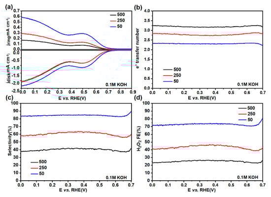 Before the electrochemical performance test, in order to eliminate the air in the electrolyte as much as possible, it is necessary to ventilate the electrolyte with N2 for 30 min. Then, the cyclic voltammetry (CV) curve was tested at a scan rate of 50 mV∙s−1, with at least 40 cycles until the CV curve remained stable. Then ventilate the electrolyte with O2 for 30 min. After that, the cycle was repeated 20 times at a scan rate of 10 mV∙s−1 until the CV curve remained stable. Finally, the linear sweep voltammogram (LSV) in the O2-saturated electrolyte was measured by polarization curves and a rotating ring disk electrode (RRDE). The ORR polarization curve was saved by adjusting the rotating disk electrode device to keep the electrode rotation speed at 1600 rpm and the scan rate at 10 mV∙s−1 for measurement.