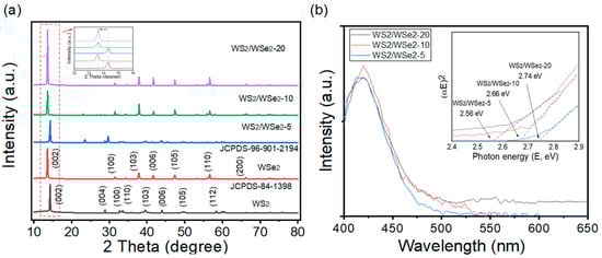(a) XRD patterns of the as-prepared samples; (b) UV–vis spectra of WS2/WSe2-5, WS2/WSe2-10, and WS2/WSe2-20 samples; plots of (αhυ)2 versus hυ for the bandgap energies of the photocatalysts in the inset.