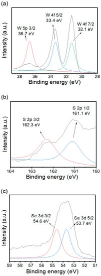 XPS survey spectra of WS2/WSe2. High-resolution XPS spectra of the (a) W 4f, (b) S 2p, and (c) Se 3d.