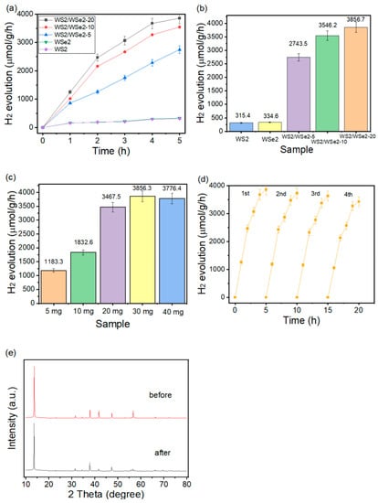 H2 evolution of (a) WS2, WSe2, and WS2/WSe2-20 and H2 production comparison of (b) WS2/WSe2-5, WS2/WSe2-10, and WS2/WSe2-20. (c) H2 production with various usage amounts of WS2/WSe2-20. (d) H2 production of the cycling performance, (e) XRD analysis of WS2/WSe2-20 before and after the hydrogen production activity.