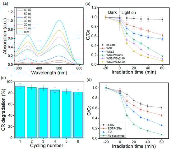 It can be noted from Figure 5a that the feature absorption intensity of CR at 346 and 497 nm apparently decreased with increasing irradiation time, confirming that CR was practically degraded by the WS2/WSe2-20 nanocomposite. The above photocatalytic results revealed that decreased preparation of WS2/WSe2-20 nanocomposite accelerated the separation rate and space charge transfer distance of photoexcited charge carries, thus improving the photodegradation performance [20]. To further check the photodegradation performance of the photocatalyst, the photodegradation of the CR pollutant was conducted. Figure 5b displays the adsorption equilibrium test in dark for 20 min, the adsorption number of CR via all photocatalysts is negligible. The blank test shows that the self-photocatalytic of CR could be ignored, indicating that the property of CR is stable in the photocatalytic activity. WS2 and WSe2 have poor capability for CR removal with visible light irradiation, which are 38.6%, and 46.5% within 60 min, respectively. Noticeably, WS2/WSe2-5, WS2/WSe2-10, and WS2/WSe2-20 approaches the better photocatalytic capability for CR removal, which is 82.5%, 88.3%, and 92.4%. Corresponding to photocatalytic hydrogen evolution, the operation series of photocatalytic MB removal is as follows: WS2/WSe2-20 > WS2/WSe2-10 > WS2/WSe2-5 > WSe2 > WS2. Moreover, the CR degradation performance of WS2/WSe2-20 is 2.4 and 2 times that of WS2 and WSe2 samples, respectively. Figure 5c displays the cycling experiment of WS2/WSe2-20 for photo degradation CR pollutant. The photodegradation efficiency decreases slightly from 92.4% to 82.1% after six repeated cycling tests, which verify that WS2/WSe2-20 has excellent stability and repeatability in the photo degradation CR process.