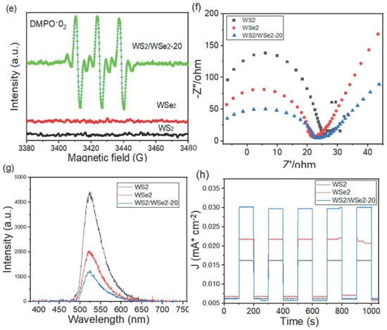 To further confirm the active species of photocatalyst, the influences of various capture agents during the photocatalytic activity were proved. The capture agents are isopropanol (IPA) for OH, benzoquinone (BQ) for O2−, and EDTA-2Na for h+. When IPA is adopted into the photocatalytic activity, the photocatalytic reaction slightly diminishes, implying that OH has weak effect on CR removal in Figure 5d. On the other hand, when BQ or EDTA-2Na is adopted into this test, the photocatalytic efficiency decreases obviously, implying that h+ and O2− are the major active species [21]. Furthermore, the ESR analysis (Figure 5e) indicates that WS2/WSe2-20 has the DMPO-O2− adduct signal, which also verifies that O2− exists in the photocatalytic activity. Electrochemical impedance spectroscopy (EIS) was performed to check the transportation and charge carries separation rate of nanocomposite surface [22]. In Figure 5f, the Nyquist semicircle radius of WS2/WSe2-20 is significantly smaller than that of pure WS2 and WSe2, verifying that the transfer resistance of photoexcited electrons and holes in WS2/WSe2-20 is the smallest among these catalysts. It was indicated that the WS2/WSe2-20 improved the charge transfer ability for composite. To further study the charge carries transfer and separation capability of the nanocomposites, a PL measurement was conducted. Figure 5g exhibits the PL spectra of WS2, WSe2, and WS2/WSe2-20 under 420 nm excitation. Compared with WS2 and WSe2, the PL peak intensity of WS2/WSe2-20 decreases significantly. The PL intensity decreased in the order of WS2/WSe2-20 < WSe2< WS2, clearly describing that WS2/WSe2-20 sample presented the better the electrons and holes separating capability, which was in good agreement with above EIS analysis results. The result demonstrated that the WS2/WSe2-20 nanocomposite can mainly transfer photoexcited electrons and holes to inhibit their recombination ability. As shown in Figure 5h, these results demonstrate that the bare WS2 and WSe2 present a poor transient photocurrent response with visible light irradiation for several on–off cycles. This low photocurrent response of bare components can be attributed to the quick recombination rate of the photoexcited charge carriers. WS2/WSe2-20 exhibits excellent photocurrent intensity than bare WS2 and WSe2, which implies enhanced charge carrier separation and migration in the heterojunction photocatalyst. All above results apparently verify that the photoexcited electrons and holes in WS2/WSe2-20 could be effectively transferred and separated.