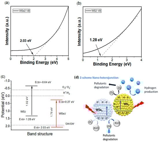 Accordingly, the above results of different data analysis and previous investigations, the probable photoexcited charge carries transport paths for the enhanced photocatalytic efficiency are recommended in Figure 6. According to the prior study, the bandgap value of the made WSe2 sample was 1.76 eV, and the bandgap value of WS2 was 1.92 eV [23,24]. The VB-XPS analysis was also concluded to establish the VB levels of WSe2 and WS2, and the results are displayed in Figure 6a–c. Obviously, the VB levels of WSe2 and WS2 were calculated to be 2.03 and 1.28 V, respectively. Furthermore, the CB potential of WSe2 and WS2 were calculated by the formula (Eg = EVB − ECB), which were 0.27 eV and −0.64 eV, respectively. Both WS2 and WSe2 were induced and excited charge carries on their valence bands (VB) and conduction bands (CB) under visible light irradiation conditions owing to their narrow band energies. Accordingly, the photo-induced charge carries were transferred from VB and CB of WS2 to the consistent positions of WSe2 due to band gap energy difference. Because of the nanocomposites, the confined charge carries with high energy enhanced in the heterostructure can be transported rapidly to the photocatalyst surface across the tunneling influence to contribute to the chemical redox activity. Therefore, some section of the photoexcited electrons and holes could also directly contribute to the redox reaction owing to the nanocomposite developed in heterojunction WS2/WSe2-20 nanomaterials. This result was similar to the previous studies [25,26,27]. The photoexcited charges collected on surface of photocatalyst can directly contribute to the reduction of H2O to H2 under the hydrogen production process. Then the nanocomposite was the main active site for reaction. For the photodegradation process of CR, the electrons on the surface of photocatalyst respond to O2 to generate O2− and H+ is reduced to H2, which was the primary active site for degradation of CR and hydrogen production. At the same time, the holes created as a result of directly oxidation on CR organic molecule cause H2O to generate OH. This is in good agreement with the ESR trapping results. The possible mechanism for the enhanced photocatalytic activity from above experiment analysis were as follows: (1) The extended specific surface area was profitable for creating more active species and better photoactivity; (2) the improved visible light absorption range can improve the light capture efficiency to promote photocatalytic application; (3) the synthesized heterostructure with preferred interface contact offered better transfer pathway for charge carries, which can promote photoexcited electrons and holes separation capability to enhance the photocatalytic efficiency.