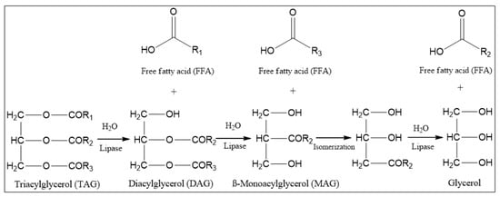 Hydrolysis of triacylglycerols catalyzed by lipase.