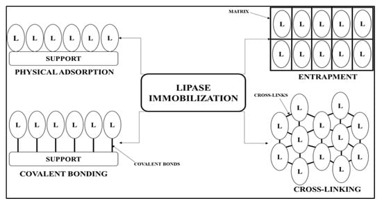 The simplified division of immobilization techniques. “L” indicates a lipase molecule.