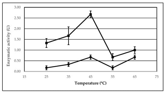 Effect of temperature on the activity of AA-ANL in free form (circles) and immobilized onto IB-150A support (squares). Reaction mixture: free AA-ANL (5.0 ± 0.2 mg) or AA-ANL immobilized on IB-150A beads, phosphate buffer (100 mM, pH 7.4), and an emulsion containing equal volumes of peanut oil and gum arabic suspension. The mixture was incubated for 30 min. The error bars represent the standard deviations of the mean.