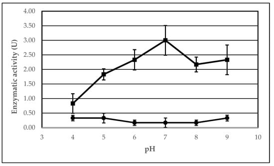 Effect of pH on AA-ANL activity in free form (circles) and immobilized onto IB-150A (squares). Reaction mixture: free AA-ANL (5.0 ± 0.2 mg) or AA-ANL immobilized onto IB-150A beads, phosphate buffer (100 mM, pH in the range of 4–9), and an emulsion containing equal volumes of peanut oil and gum arabic suspension. The mixture was incubated for 30 min. The error bars represent the standard deviations of the mean.