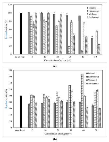 - Kamal, M.Z.; Yedavalli, P.; Deshmukh, M.V.; Rao, N.M. Lipase in aqueous-polar organic solvents: Activity, structure, and stability. Protein Sci. 2013, 22, 904–915. [Google Scholar] [CrossRef] [Green Version]