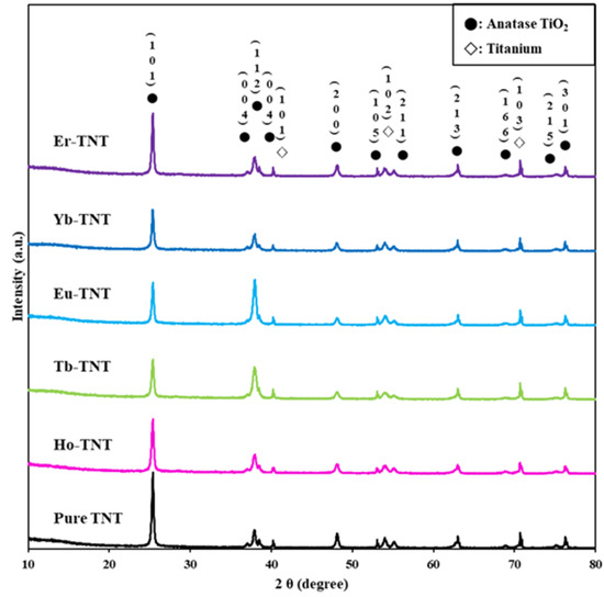 The lanthanide-doped TNT was prepared using the electrochemical process in a two-electrode system [41]. Three cells were prepared with the following structure: amorphous TiO2 as the working electrode, Pt gauze (52 mesh, 99.9% trace metals basis, Sigma-Aldrich, Burlington, MA, USA) as the counter electrode, with a distance of 2 cm between the two electrodes, and 150 mL of 0.01 wt.% Ln2(NO3)3 aqueous solution (Ln3+ = Ho3+, Tb3+, Eu3+, Yb3+, and Er3+) as the electrolyte. Electrochemical doping was conducted with a constant current of −0.1 mA cm−2 for 200 s. The samples were then washed with distilled water, dried at room temperature (approximately 25 °C) overnight, and annealed in oxygen atmosphere (400 mL min−1) at 450 °C for 2 h.