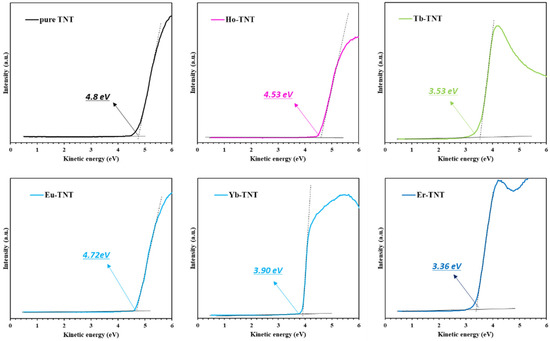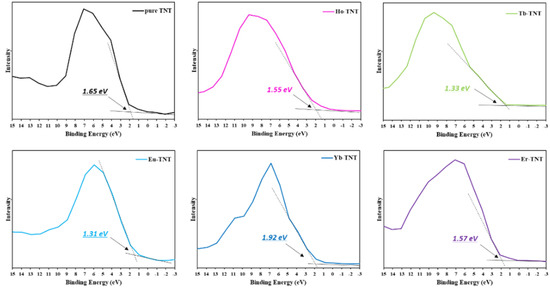The potential of the valence band maximum (VBM) positions was determined by linearly extrapolating the intersection of the background near the Fermi level and the leading edge [25]. Values obtained in Figure 4 are summarized in Table 2. The VBM of the pure TNT was −6.45 eV, and all doped TNTs up-shifted in the positive direction because of the creation of a new energy level within the bandgap by the lanthanide.