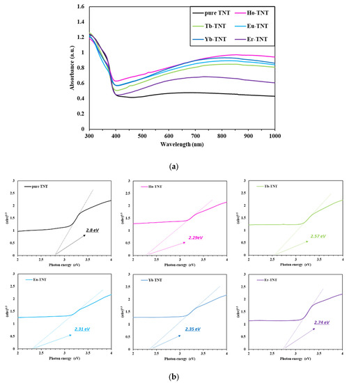 The bandgap is the minimum energy required for electrons to be excited from the valence band to the conduction band. It is critical for explaining the photocatalytic properties because it determines the wavelength range of light that can be absorbed. Therefore, the diffuse reflectance spectra were analyzed to examine the optical properties of the prepared samples and estimate the bandgap. Figure 5a shows the comparison of the variation in the absorbance according to the wavelength for the catalysts doped with lanthanide. All samples were photocatalysts based on TiO2 and commonly showed the maximum absorption wavelength in the UV range below 400 nm. The visible light range of the lanthanide-doped TNT increased noticeably when compared with that of pure TNT. The largest difference was observed in the case of the electrode doped with holmium. The introduction of lanthanide enables effective solar energy utilization by improving the light-harvesting properties in the visible light range [26]. Each prepared electrode was an indirect bandgap semiconductor, and the bandgap was determined based on the Tauc plot generated using [27]