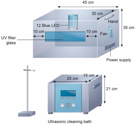 Then, the characteristics and positioning of the light source and heat-transfer properties are critical for the outcome of the studied chemical transformation. A schematic illustration of our designed, complete, and functional cleaning bath sonophotoreactor referred to as a CBSPR is represented in Figure 1. According to the Beer–Lambert law, light transmittance decreases exponentially with the distance from the light source [44].