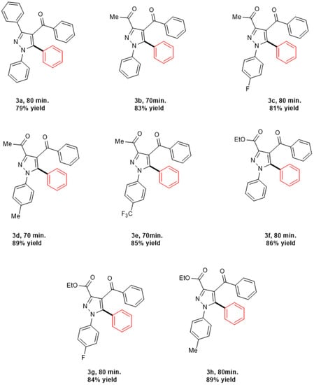 The products 3a-h were obtained at acceptable yields (79–89%) (Figure 2), which shows the beneficial effects of the sonophotoreactor on this reaction. The obtained spectroscopic data of the reaction products 3a-h and the proper elemental investigation reinforced the pyrazole structure formed in each case for 3a-h (cf. Supporting Information S2). There are numerous studies showing that cavitation acoustic waves, which are responsible for the formation of bubbles in liquid, are responsible for increasing the rate and selectivity of sonochemical reactions [46,47,48,49]. In addition, the cavitation intensity increases with increasing frequency and solvent type. For the sonochemical reaction to be successful, the solvent used must be carefully chosen. The vast majority of procedures are carried out in a wet environment. As an alternative, we utilized dimethyl formamide (DMF) in our reaction. DMF has a high vapor pressure at 70–80 °C [50], which is ideal for cavitation. The low viscosity of DMF makes cavitation easier [51,52]. As a result of these findings, it can be concluded that DMF is a better solvent than the others.