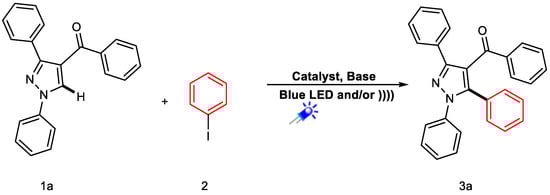Optimization of the reaction conditions for the C-H arylation of pyrazole. First, we carried out this reaction under various conditions, including catalyst, ultrasound irradiation, and/or blue LED light; optimization of the reaction conditions was conducted at several stages, including the main stage, which is the catalytic activity study.