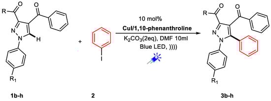 As Budiman et al. demonstrated, the combination of CuI and 1,10-phenanthroline, CsF, in DMF solvent at 130 °C is efficient for the Suzuki–Miyaura cross-coupling of fluorinated aryl boronate esters with aryl iodide [45]. For the above model reaction depicted in Scheme 1, Table 1 represents different experimental trials to get the best conditions. We initially tried to employ modified conditions to the C-H arylation of pyrazole 1a with phenyl iodide (2), utilizing ultrasound irradiation at 80 °C in presence of 10 mol% CuI and obtained only a 39% isolated yield of the C-H arylated pyrazole 3a after 3.5 h (Table 1, entry 6). This model reaction was carried out on the same scale utilizing the blue LED light only at 80 °C, we separated a yield of 3a as 31% after 9 h (Table 1, entry 7). The reaction performed on the designed sonophotoreactor led to a better yield in the shortest reaction time in which we obtained a 48% yield in 2 h of arylated pyrazole 3a (Table 1, entry 8).
