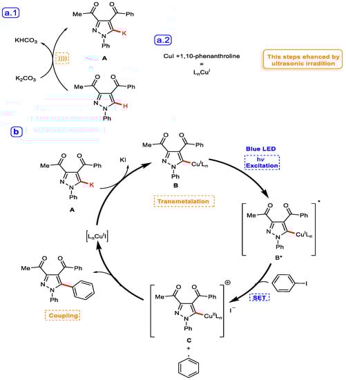 A tentative mechanism was proposed for the synergistic effect observed in the sonophotoreactor based on the well-established mechanism for the effect of ultrasound in the presence of homogeneous catalysts such as complexes [55,56]. In this case, an alkali metal base deprotonated a relatively acidic sp2 C-H bond before transmetalation and coupling with an aryl halide were performed on it [55,56]. The known mechanism for the effect of visible light on catalytic reactions involving complexes (photocatalytic reactions) [57] was also taken into consideration, which involved single electron transfer (SET). Herein, the reaction proceeded by initial deprotonation of a relatively acidic sp2 C-H bond by an alkali metal base (K2CO3) forming an intermediate A, which was further enhanced by ultrasonic irradiation (step I, Scheme 3). Then, the formation of the copper metal complex (intermediate B) via transmetalation was ultrasonically enhanced. The complex (B) was excited by blue-light absorption to give the intermediate B*, which was followed by single electron transfer (SET) to phenyl iodide, by effect of blue LED, generating copper II complex (C) and phenyl radical. Consequently, the phenyl radical, in the presence of the proper radical acceptor, formed the functionalized pyrazole and regenerated the catalytical competent copper(I) complex (Scheme 3). Notably, the observed synergistic effect is attributed mostly to the change in the number of cavitating bubbles due to an increasing degree of coalescence. The results also suggested that sonophotocatalytic reactions occur at the bubble–liquid interface. In the center of the bubble, the concentration of free radicals “produced by the effect of the blue LED” is at its highest point, and it gradually declines in a Gaussian way as one approaches the interphase owing to radical recombination [58]. In the interphase, the phenyl radical reacts rapidly with the intermediate C, resulting in a buildup of the sonoproduct concentration.