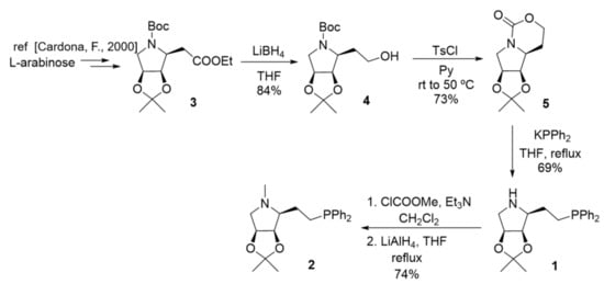 Finally, starting from D-mannose (Scheme 5), the N-Boc protected pyrrolidine-phosphine 17 [23], with a 2,3-cis configuration in the pyrrolidine backbone, was prepared. Then, reduction with LiAlH4 in THF at reflux afforded the N-methyl derivative 18 in good overall yield.