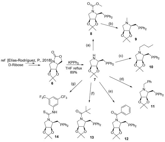 Starting from D-ribose (Scheme 3), pyrrolidine phosphine 7, which presents a shorter phosphine alkyl chain, was prepared following the procedure reported by us [23] that implies the ring opening of the cyclic carbamate 6 by reaction with KPPh2 in THF. N-methyl derivative 9 [22] was prepared by reaction of 7 with methoxycarbonyl chloride affording 8 and subsequent reduction with LiAlH4 in THF at reflux. The reductive amination of 7 with butanal and benzaldehyde afforded N-butyl- and N-benzyl-pyrrolidine derivatives 10 and 11, respectively. Standard acylation of 7 using benzoyl and pivaloyl chloride afforded the pyrrolidine derivatives 12 and 13, respectively, in excellent yields. Finally, the reaction of 7 with 3,5-bistrifluoromethylisothiocyanate gave the thiourea-phosphine derivative 14 [23] in moderate yield.