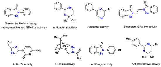Among organoselenium compounds with biological activity, the leading place is occupied by selenium-containing heterocycles. The selenium heterocycles exhibit diverse biological activities, including antibacterial, antitumor, anti-HIV, anti-inflammatory, antiviral, antiproliferative, and glutathione peroxidase-like properties (Figure 1) [3,4,5,6,7,8,9,10,11,12,13,14,15,16,17,18,19,20].