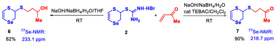 In the preliminary experiments with methyl vinyl ketone, the hydrobromide 2 reacted in homogeneous systems NaOH/NaBH4/water/THF and NaOH/NaBH4/EtOH at room temperature. Under these conditions, alcohol derivative 4-(2,3-dihydro-1,4-thiaselenin-2-ylsulfanyl)-2-butanol (6) was isolated in 82% yield instead of the expected product, containing the ketone group (Scheme 2).
