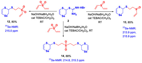 It is worthy to note that the products 12 and 13, containing vinylsulfonyl and vinylsulfinyl groups, are capable of further addition reactions. When a two-fold molar excess of hydrobromide 2 with respect to divinyl sulfone was used, bis[2-(2,3-dihydro-1,4-thiaselenin-2-ylsulfanyl)ethyl] sulfone (14) was obtained in 88% yield (Scheme 5). Under the same conditions, the reaction with divinyl sulfoxide was complicated by side processes with the formation of a mixture, from which the expected bis-adduct could not be isolated by column chromatography and re-crystallization methods.