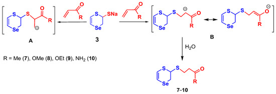 The nucleophilic addition of dihydro-1,4-thiaselenin-2-ylthiolate anion to activated alkenes proceeds as a 1,4-conjugated addition, and the carbonyl (or sulfonyl) group plays an important role in stabilizing the reaction intermediates. It is well-known that the carbonyl group has a high ability to stabilize the negative charge on the adjacent carbon atom. The negative charge is well-stabilized by the carbonyl group in intermediate B due to the mesomeric effect (relevant resonance structures are outlined in Scheme 6). The protonation of intermediate B by water leads to the formation of the products 7–10. There is no such stabilization in intermediate A.