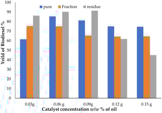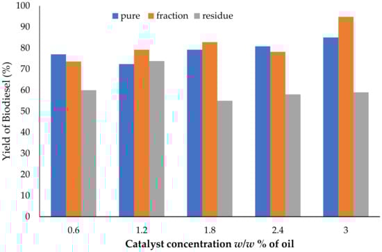 Effect of catalyst concentration on the yield of biodiesel produced from hydrolyzed pure oil, fraction of oil, and residue.