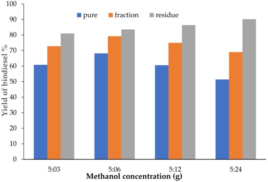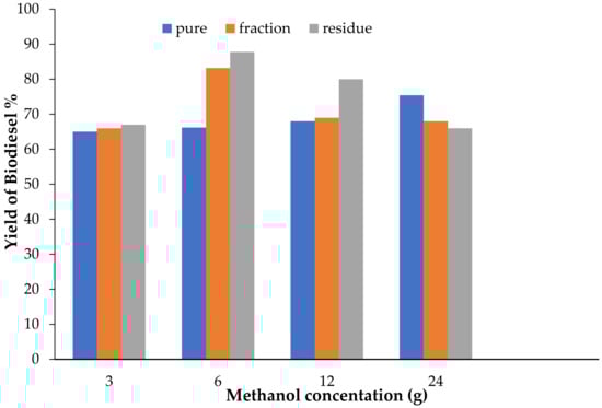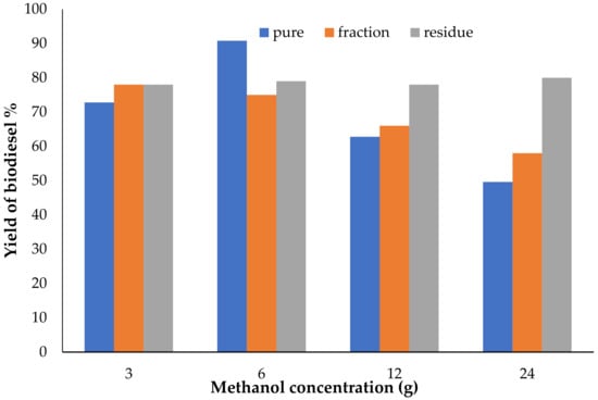 Effect of methanol concentration on the yield of biodiesel produced from interesterified pure oil, fraction of oil, and residue.