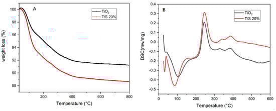 Thermogravimetric (TG) and differential scanning calorimetric (DSC) analysis data of TiO2 gels prepared without SiO2 and with 20% SiO2 are shown in Figure 1. The DSC curve shows that the TG exhibit three similar thermal accidents, although they are different from each other in terms of weight changes. The first loss at approximately 100 °C corresponds to the removal of adsorbed water, on pure TiO2 and the 20% T/S composite, respectively. The second loss with a large exothermic peak at 245°C corresponds to the partial elimination of hydroxyl groups. It can be seen that the weight loss of T/S 20% is higher than that of TiO2. This may be due to the presence of more hydroxyl groups introduced by SiO2 that are easier to eliminate at 245 °C [27]. Finally, the last loss corresponds to the transformation of amorphous TiO2 to crystalline TiO2 anatase observed at 381.8 °C for pure TiO2 and increases to 386.1 °C for the T/S 20% composite in agreement with the X-ray diffraction results (see next section).
