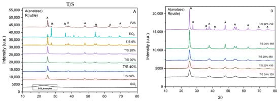 X-ray diffractogram of samples (A): SiO2, T/S–X at 650°C (B): TS 20%–T.