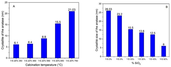 Anatase crystallite sizes of samples (A): T/S 20%–T (T = Temperature); (B): T/S–X (X = wt% SiO2) calcined at 650 °C.