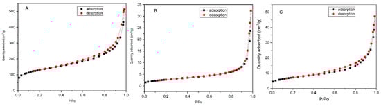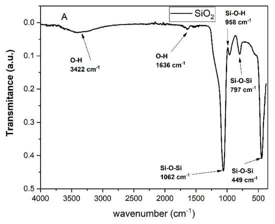 The IR spectrum of SiO2 is given in Figure 6A, and the bands at 1063 and 799 cm−1 correspond to the characteristic asymmetric and symmetric stretching vibrations of the Si-O-Si bond, respectively. The bands at 958 and 450 cm−1 are attributed to the stretching vibrations of Si-O-H and Si-O bonds, while the bands at 1632 and 3414 cm−1 correspond, respectively, to the bending vibration of the Si-O-Si bond and stretching vibrations of the O-H bond adsorbed water [29].