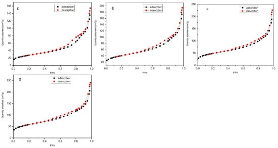 Nitrogen adsorption–desorption isotherm curves for (A) SiO2, (B) TiO2, (C) T/S 5%, (D) T/S 20%, (E) T/S 30%, (F) T/S 40%, (G) T/S 50%.