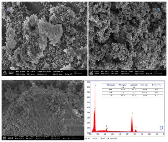 Scanning electron microscopy (SEM) of (A) SiO2, (B) TiO2, (C) T/S 20%, and (D) EDX-T/S 20%.