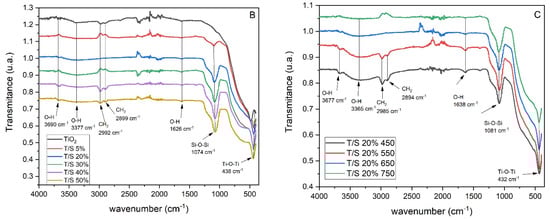 Comparing the IR spectrum (Figure 6A) of SiO2 to the IR spectra (Figure 6B,C) of samples with different SiO2 contents and varying the calcination temperature, a weak band at approximately 3650 cm−1 is observed, which corresponds to the O-H bonds of the coordination water. The broad bands at approximately 1630 and 3400 cm−1 correspond to the deformation and stretching vibrations, respectively, of the O-H bond of adsorbed, bound, or free water. The characteristic bands at 2985 and 2894 cm−1 correspond to the stretching vibrations of the -CH2 bond. The bands at approximately 1070 cm−1 are attributed to the asymmetric vibration of Si-O-Si bonds in SiO2 [30]. It can be noted that the number of hydroxyl bonds and the surface Si-O-Si bonds increases as the SiO2 content increases (Figure 6B), and the O-H bonds in the T/S 20% sample remain constant until the calcination temperature reaches 650 °C. These results suggest that silica can effectively limit the loss of surface hydroxyl groups during calcination, thus the hydroxyl groups on the surface of the samples can be preserved, which is beneficial for the photocatalytic reaction in that these groups can increase molecule adsorption via coulombic attractions. This can be confirmed by the band at approximately 3400 cm−1, which becomes broader. The decrease in the intensity of hydroxyl groups with increasing temperature (Figure 6C), can be caused by the aggregation of TiO2 nanoparticles, which release the surface hydroxyl groups from SiO2 and then become easily volatile at this temperature, according to the DRX analysis.