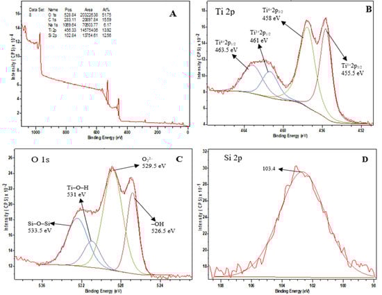 XPS spectrum of T/S 20% (A), Ti 2p (B), O 1s (C), and Si 2p (D) composites.