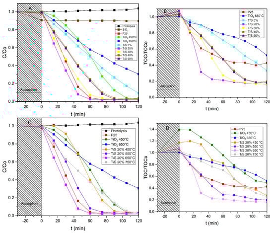 Photocatalytic degradation mineralization of SDCF in the presence of catalysts with different SiO2 content compared to pure TiO2 and commercial P25 (A,B) and in the presence of TS 20%–T catalyst calcined at different temperatures compared to pure TiO2 and commercial P25 (C,D).