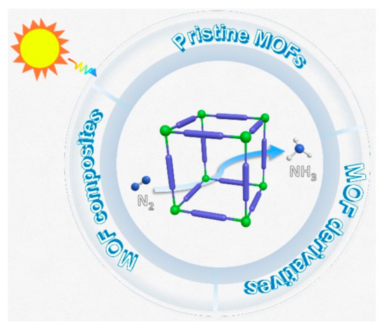 Due to their large pore volumes, adjustable pore sizes, wide light harvesting range, and high densities of exposed catalytic sites, MOFs have been explored for photocatalytic nitrogen fixation. However, it is still in its preliminary stages of development. In addition to pure MOFs, advanced MOF composites and MOF derivatives have also been studied for photocatalytic nitrogen fixation (Table 1).