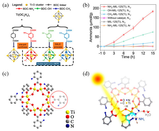 Ti-based MOFs have been widely explored in photocatalytic hydrogen production [101,102,103], photocatalytic CO2 reduction [104,105], and environmental protection; however, photocatalytic nitrogen fixation is still in its preliminary stages of development.
