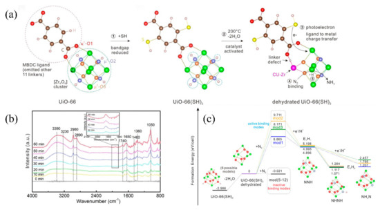 (a) Schematic evolution of UiO-66 to dehydrated UiO-66(SH)2. (b) Time-dependent in situ DRIFT spectra of UiO-66(SH)2-200. (c) The formation energy diagram for the different models simulating the N2 reduction process. Reproduced with permission [84]. Copyright 2022, Wiley Online Library.