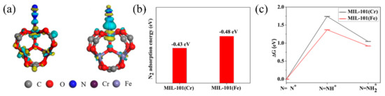 (a) Charge density difference of an N2 molecule absorbed at MIL-100(Cr) and MIL-101(Fe). (b) Adsorption energies of N2 on MIL-101(Cr) and MIL-101(Fe). (c) Calculated free energy diagram for reduction of N2 of MIL-101(Cr) and MIL-101(Fe). Reproduced with permission [85]. Copyright 2020, Elsevier.