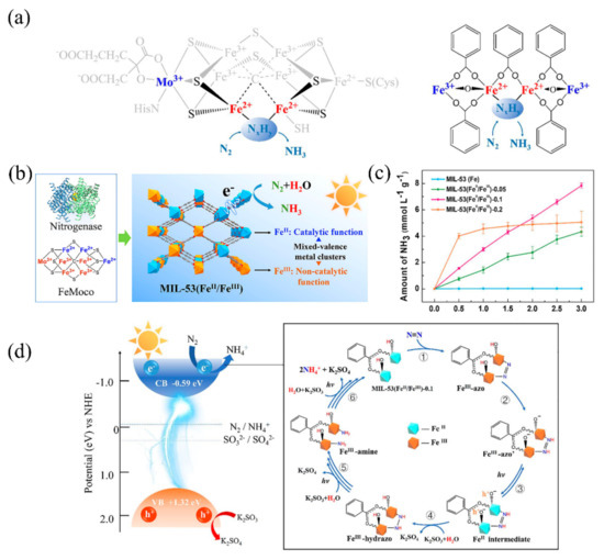 - Zhao, Z.; Yang, D.; Ren, H.; An, K.; Chen, Y.; Zhou, Z.; Wang, W.; Jiang, Z. Nitrogenase-inspired mixed-valence MIL-53(FeII/FeIII) for photocatalytic nitrogen fixation. Chem. Eng. J. 2020, 400, 125929. [Google Scholar] [CrossRef]